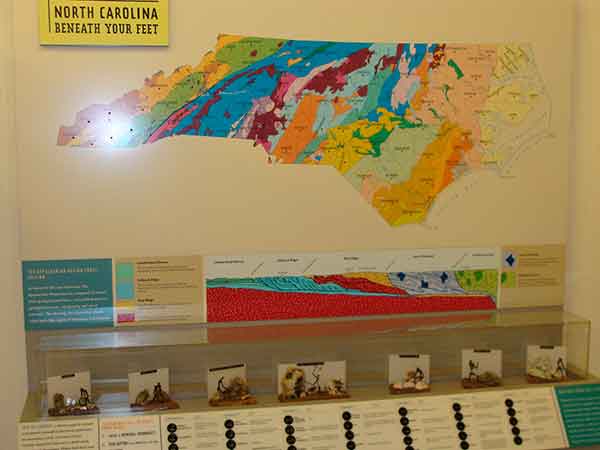 The Museum of North Carolina Minerals new exhibits are: “From Mountains to Molecules”, providing an explanation of the geological processes that formed the mountains over a million years ago, “Inside the Linville Falls Fault”, a captivating explanation why the area is rich in mineral resources and geologic activity, “From Mountains to Rocks”, explaining what minerals are and how they are identified and coded, “Mineral Mart”, a historical exhibit that displays the prominent role mineral mining served in North Carolina and how the industry shaped the economy of the state, region and overall country, “Enter the Mine”, showcases how minerals are mined, processed and incorporated into the manufacturing of numerous products.